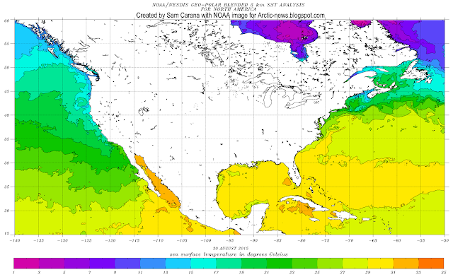 The image below shows sea surface temperatures on August 30, 2015, indicating that a huge amount of ocean heat has accumulated in the Atlantic Ocean off the coast of North America.